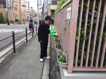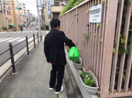 生徒会役員は、毎朝、正面玄関周りにあるプランターに水をやっています。昨年度から続いている取り組みです。