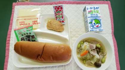 本日の献立は、とうふハンバーグ、スープ煮、スライスチーズでした。