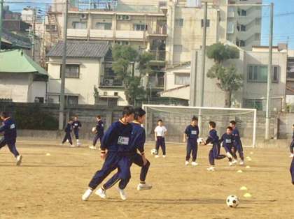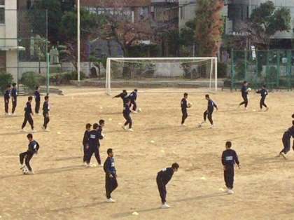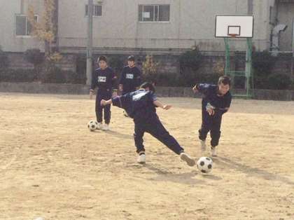 1年体育の授業の様子です。男子はサッカーを行っています。1対1でボールをキープするなどの練習です。寒い中、みんなよく動いています。