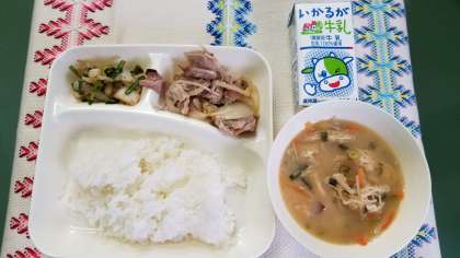 本日の献立は、豚肉のしょうが焼き、さつまいものみそ汁、きくなとはくさいのごまあえです。