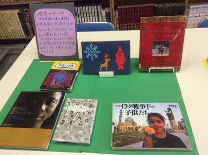 本日12月5日から読書週間が始まりました。21日までの期間は、朝1時間目の予鈴が鳴るまで読書の時間になります。各教室で全員が自分の選んだ本を読みます。図書室には新しい本がたくさん入っていますので積極的に借りに行きましょう。また、12月のテーマは「サンタクロースのように」ということで世界の子どもの状況がわかる本の紹介もされています。皆さん、たくさん本を読みましょう。