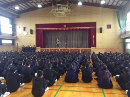 12月11日、全校集会を行いました。生活指導の先生から今週の予定と2017年の終わりに向けて気を引き締めていこうという話がありました。その後、校長先生より12月の学校目標「油断禁物」について話がありました。学期末に向けて気を緩めずにいくことと、油断という言葉は比叡山延暦寺の灯篭「不滅の法灯」が、最澄によって火を入れられて以来、油を切らすことなく1200年間消えていないところに由来しているという説があるとの話がありました。