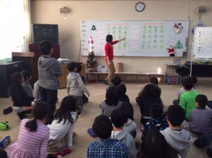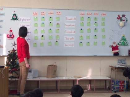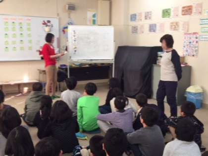 続いてグループ対抗です。英文を完成する中で、自分が選んだカードに書いてある絵で相手のグループの家をこわしたり、自分の家を修復していくゲームです。作戦が見え隠れしますね〜。小学生のみなさん、面白かったですか?