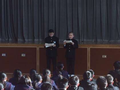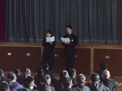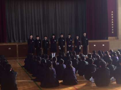 委員長の話の後、保健委員会から健康面や安全面についての話がありました。自分でしっかりと健康管理をすることや交通事故などには十分注意することなどの内容でした。写真は上から4組の委員長、委員長全員、保健委員会の順です。