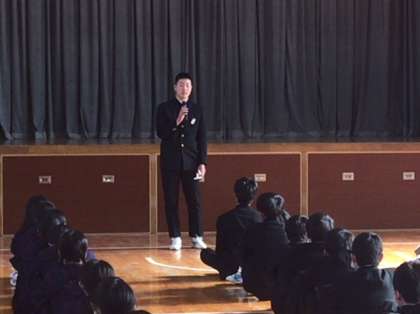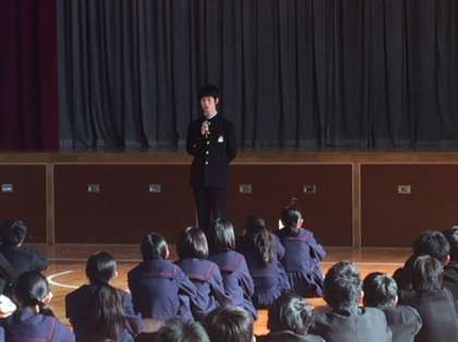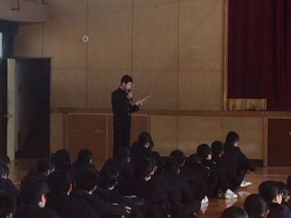4時間目は3年生の学年集会です。生徒の司会進行で各学級の代表がそれぞれのクラスの反省を述べました。写真は上から司会・1組・2組です。