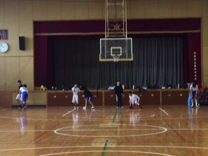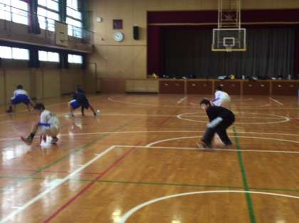 体育館では、男子バスケットボール部が基本的な練習を繰り返しています。元気よく声を出して頑張っています。