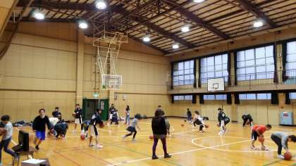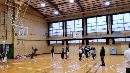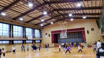 体育館では、バスケットボールが行われてます。中学生に教えてもらって、シュートが入るようになる児童もいました。