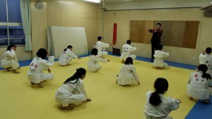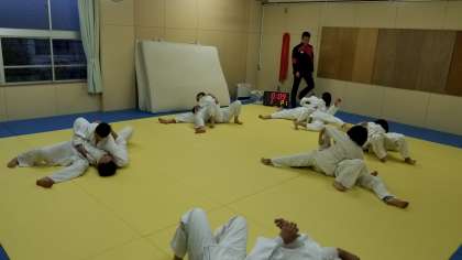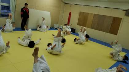 武道場では、柔道が行われています。基本動作の受け身から固め技まで、楽しくできました。