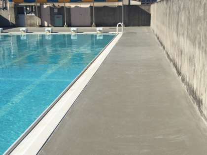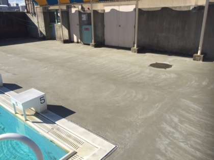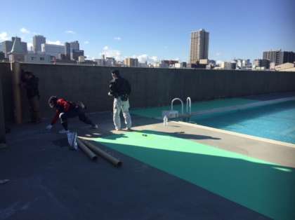 1月9日から始まったプールサイド改修工事の12日の様子です。ザラザラだったプールサイドをきれいにコーティングし、色鮮やかな床シートが張られていきます。完成が待ち遠しいですねえ。