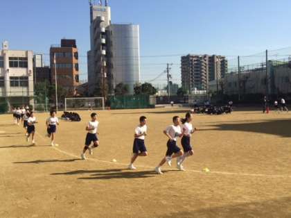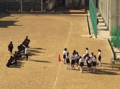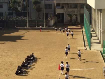 1年体育の授業の様子です。持久走が始まりました。準備運動の後2つのグループに分かれて5分間走を行いました。寒くてしんどいですが、真田山公園杯に向けてどの学年もしっかり走りましょう。