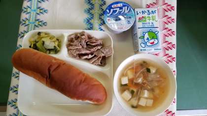 本日の献立は、豚肉のオイスターソース焼き、糸寒天のスープ、ピリ辛あえ、ヨーグルトです。