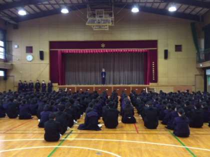 今日は全校集会の日です。マスクをしている生徒がかなりいます。今日の話は、「今年のインフルエンザはB型が流行しています。3年生は私立高校の入学試験、2年生は職場体験学習、1年生は百人一首と取り組むべきことが控えています。体調を整えることが大切です。かぜ等の予防について心がけること4点、一つ目は外出から戻ったら必ず手洗い・うがいをすること。二つ目は部屋の換気を行うこと。三つ目はしっかりと栄養を摂ること。四つ目は十分な睡眠をとること。皆さん、自己管理をしっかりとして、かぜ等ひかないようにしましょう。」という内容でした。今週も頑張りましょう。