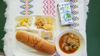 本日の献立は、鶏肉と野菜のケチャップ煮、カリフラワーとコーンのサラダ、桃のクラフティです。