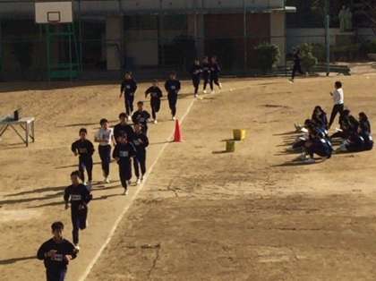 2年体育の授業の様子です。1500m走を行いました。冷たい風が吹く中、みんな力走しています。真田山公園杯に向けて頑張りましょう。