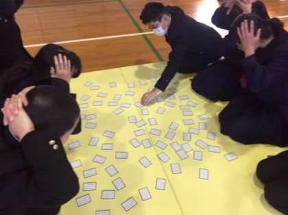中島先生の太鼓の合図のあと、稲岡先生が上の句を読み上げます。緊張感が漂う中、真剣勝負が始まりました。