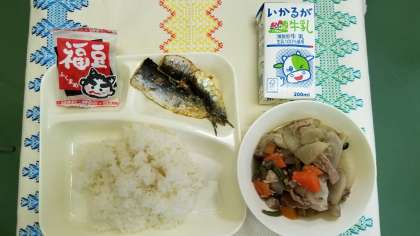 本日の献立は、いわしのしょうがじょうゆかけ、含め煮、いり大豆という節分の行事献立です。節分にちなんで、いわしやいり大豆の登場です。