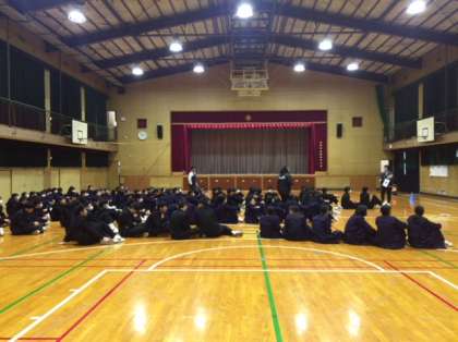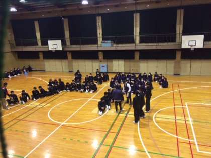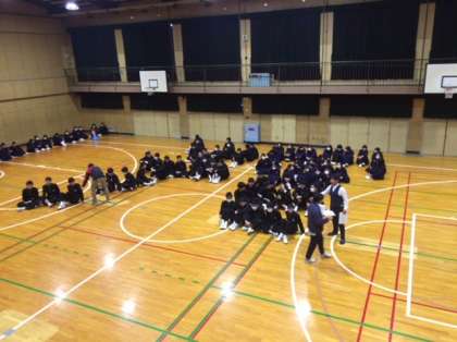 徐々に形が出来ていきますが、フロアにいるとなかなか形がわかりません。ギャラリーにいる先生との連携が大変です。なんとか完成しました。完成した字をわからないようにフロアで横から撮ってみました。何という字かは発行された新聞をお楽しみに。