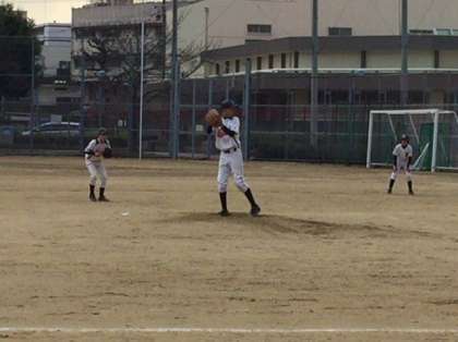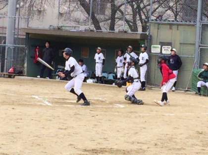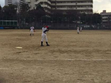 サッカー部の公式戦のあと、同じ浪速公園グランドで午後から野球部が練習試合を行いました。今年最初のゲームということです。この時期は試合の中で自分の課題を見つけ、日常の練習で修正していくことが大事です。色々なことを試していきましょう。