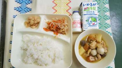 本日の献立は、関東煮、甘酢あえ、大福豆の煮もの、はっ酵乳です。