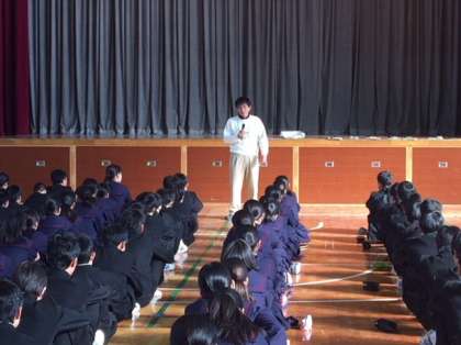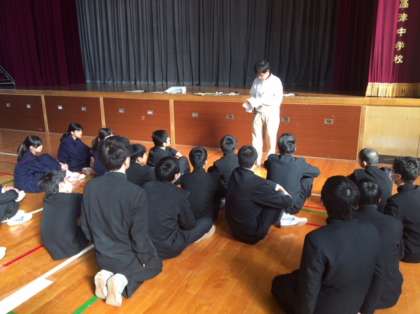 本日6時間目、2月8・9日に行う職場体験学習の事前指導を行いました。まず、竹島先生から全体的な諸注意がありました。
