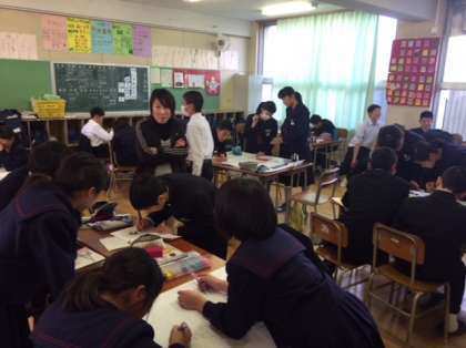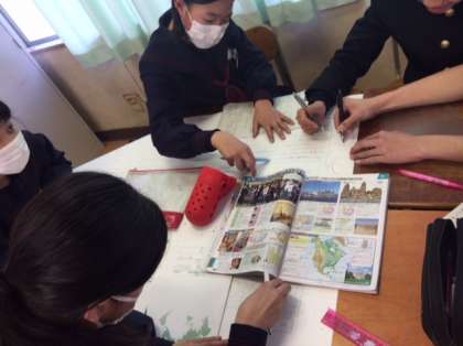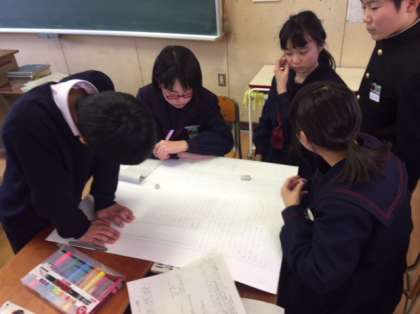 1年生は、10日の国際交流に向けて事前に調べた国について壁新聞にまとめています。各クラスの様子を紹介します。1組の様子です。