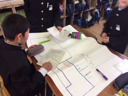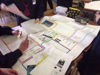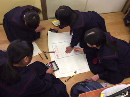 3組の様子です。このクラスは進んでいますね。どんどん色々な色を使って書き込んでいます。キレイな新聞が出来そうですね。