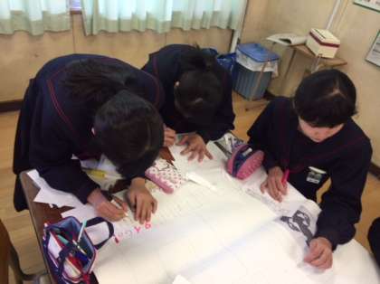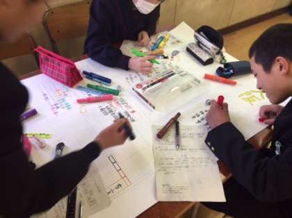4組の様子です。このクラスも調べた資料に基づいて作業が進んでいます。みんな仲がいいですね。完成が楽しみです。