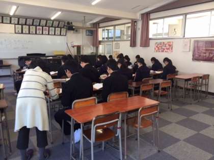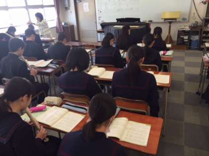 2年音楽の授業の様子です。まずアルトリコーダーの練習です。曲は「虹の彼方に」です。次に歌「花の季節」の練習をしました。曲の速さの変化がすごいですね。この後、新しい歌「心の中にきらめいて」の練習もしました。「この曲、聞いたことありますか?」と先生がピアノを弾くと、「あっ、ボートレースのコマーシャル!」「渡辺直美や」と口々に反応がありました。なるほど。