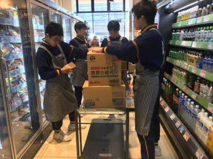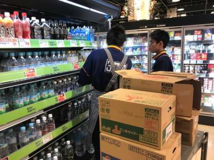 阪急オアシスの様子です。こちらも商品を棚に並べる作業をしています。飲み物は結構重たいと思います。気をつけて扱いましょう。