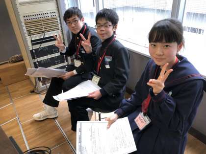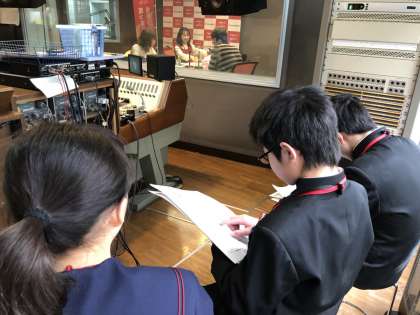 大阪放送株式会社(ラジオ大阪)の様子です。生放送の番組を見学をしていました。ガラスの向こうがスタジオで、こちら側にミキサーやたくさんの機器があり、音楽を流したり、キューを出したりしていました。