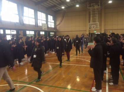 2月10日、1年生は国際交流を行いました。留学生7ヵ国9人を招いての交流です。まずは全体会です。