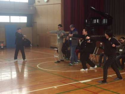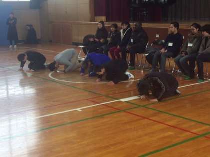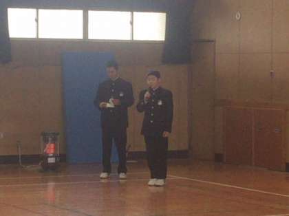 次に空手の紹介と実演です。留学生2人と生徒・先生1人ずつ出て行いました。なかなかいい突きでした。