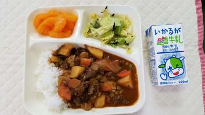 本日の献立は、 ハヤシライス、キャベツのひじきドレッシング、みかんです。