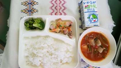 平成28年度献立コンクール優秀賞の献立です。ねらいは「もりだくさんの野菜で栄養満点、ひとつの色じゃつまらない!彩りの良い野菜をたくさん使用し、見た目をカラフルにして、苦手な野菜を食べやすくしました。」です。