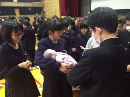 ほぼ全員の生徒が抱っこ体験をし、にぎやかに感じたことを話し合っていました。将来、この経験が生きるといいですね。最後に3つ子を出産した女性の例を挙げ、出産には大きなリスクを背負う事もあるが、その誕生は喜びも大きいという話がありました。