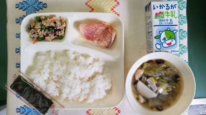 本日の献立は、赤魚のレモンじょうゆかけ、うすくず汁、高野豆腐のいり煮、焼きのりです。