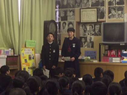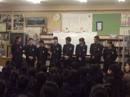 本日午後、1年生は図書室において、国際交流会発表会を行いました。2月10日に実施した留学生を招いての国際交流会について各クラスがグループに分かれて発表しました。司会進行はクラスの委員長です。まずは前に並んで挨拶しました。