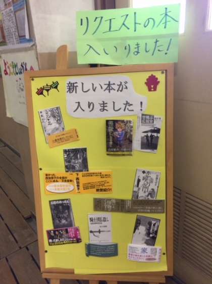 今日の図書室の様子です。3月9日から始まる平昌パラリンピックに合わせて本が紹介されています。火曜日は学校図書館補助員の中石さんが来られています。生徒のいない授業中に「新しい本の紹介」を作成しています。