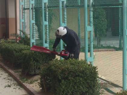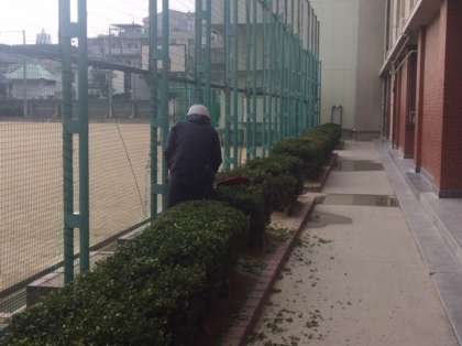 午後からは、テストで1・2年生がいないので校舎付近の剪定です。チェーンソーできれいに刈られていきます。