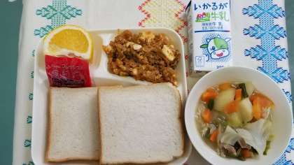 本日の献立は、とうふのミートグラタン、スープ煮、はっさくです。