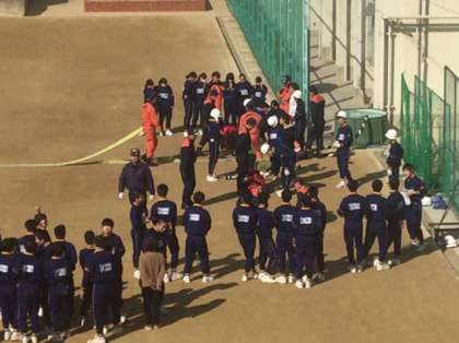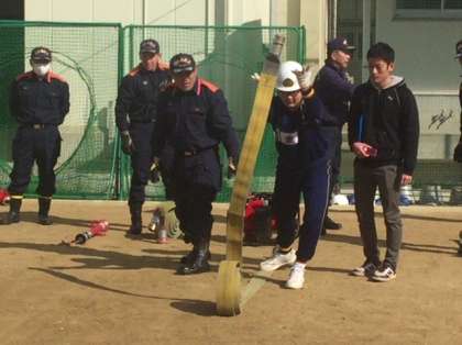 可搬式ポンプの使い方です。ホースを勢いよく伸ばしますが、なかなかうまくいきません。でも褒めらている生徒もいます。