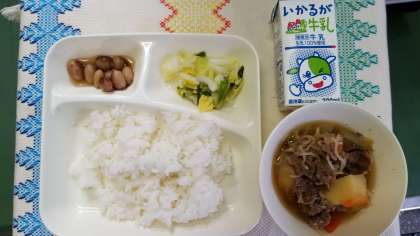 本日の献立は、肉じゃが、はくさいの甘酢づけ、とら豆の煮ものです。