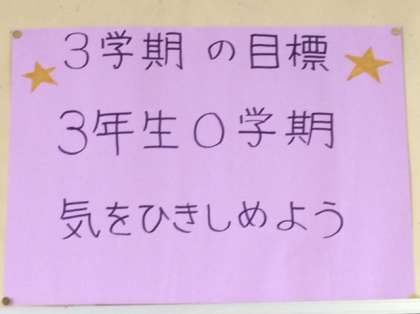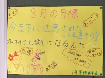 1・2年の学年の目標が廊下などの掲示板に貼られています。1年生は「今までに注意されたことを直そう!カッコイイ上級生になるんだ」。2年生は「3年生0学期、気をひきしめよう」です。どの学年も上の学年を意識したいい目標ですね。
