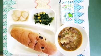 本日の献立は、豚肉と野菜のカレー煮、ほうれん草のソテー、あげポテトもちです。