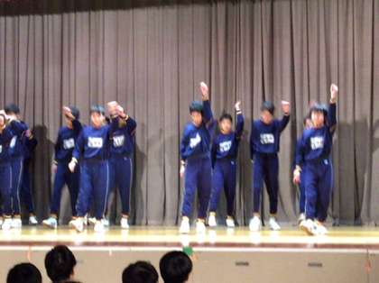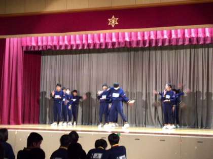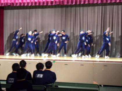 本日の1・2年の体育の授業は、ダンスの発表会です。2時間目、まずは2年1・2組の発表です。2組の男子がトップバッターです。ムーンウォークのソロが出ました。