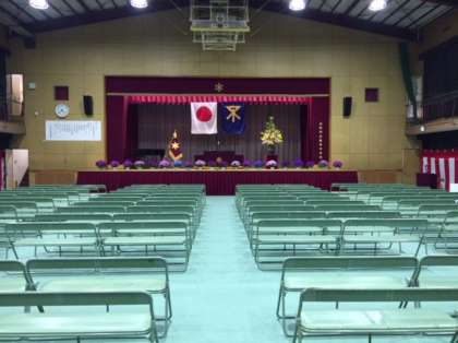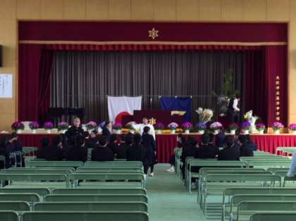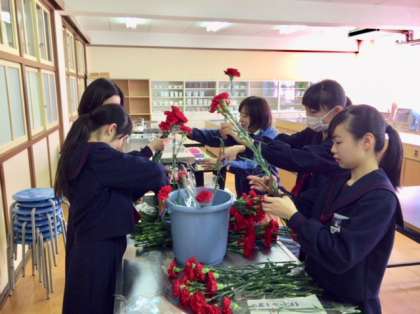 花の用意も終え、式場もほぼ完成です。答辞・送辞の練習が始まります。