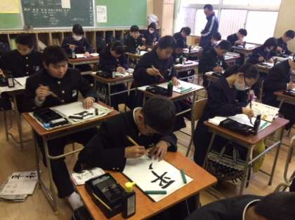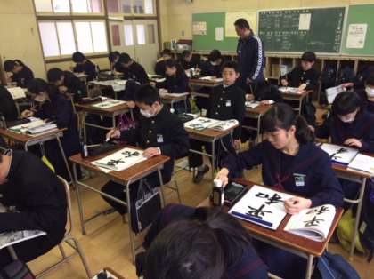 1年国語の授業の様子です。書写を行っています。行書「平和」の練習をしました。静かに真剣に取り組んでいます。行書は筆の流れに神経を使いますね〜。