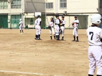 1回戦の相手は東三国中学校です。互いに譲らず、0対0のまま7回を終了。無死満塁からのタイブレークになりました。