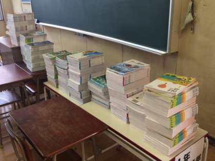 新入生を迎えるにあたり、1年生の各教室には真新しい教科書が運びこまれました。4日の入学式に向けて準備が進んでいます。