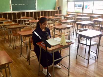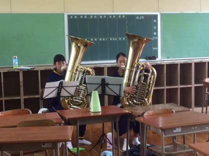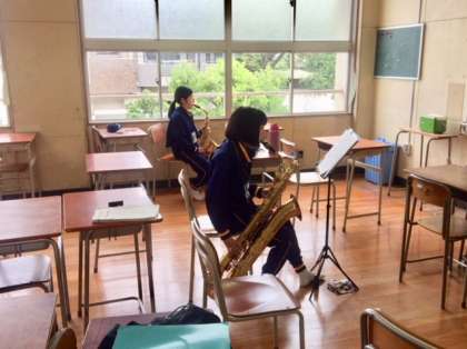 吹奏楽部は教室に分かれてパート練習を行っています。休み中なのでたくさんの教室が使えますね〜。